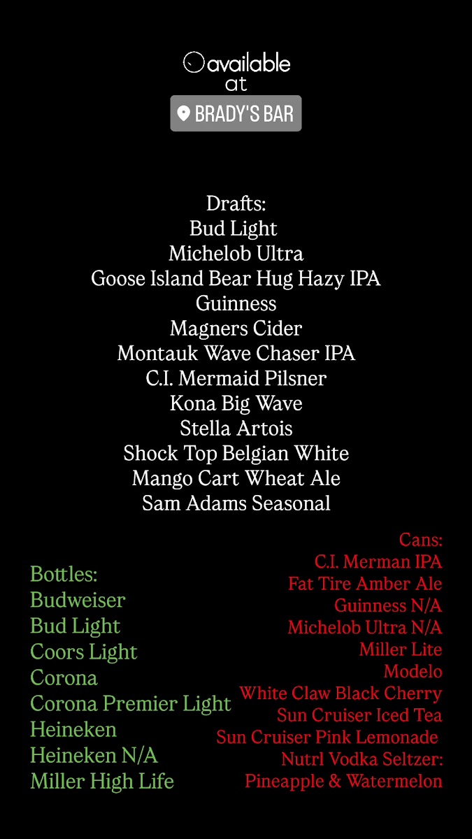 Brady’s offers a straightforward menu that complements its lively and unpretentious atmosphere. Expect a selection of casual bites and comforting drinks that fit perfectly with a night out watching the game, catching live music, or relaxing with friends. The food is simple and satisfying, while the drinks focus on classic, well-crafted cocktails and hearty pours.